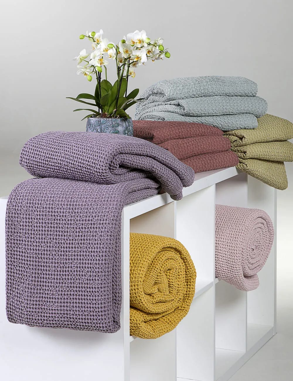 Copriletto Leggero Matrimoniale della linea Bloom di Tessitura Randi 1931, in 100% cotone nido d’ape tinto in capo, con trattamento “Stone Washed” per un capo dai colori unici ed un aspetto vissuto.