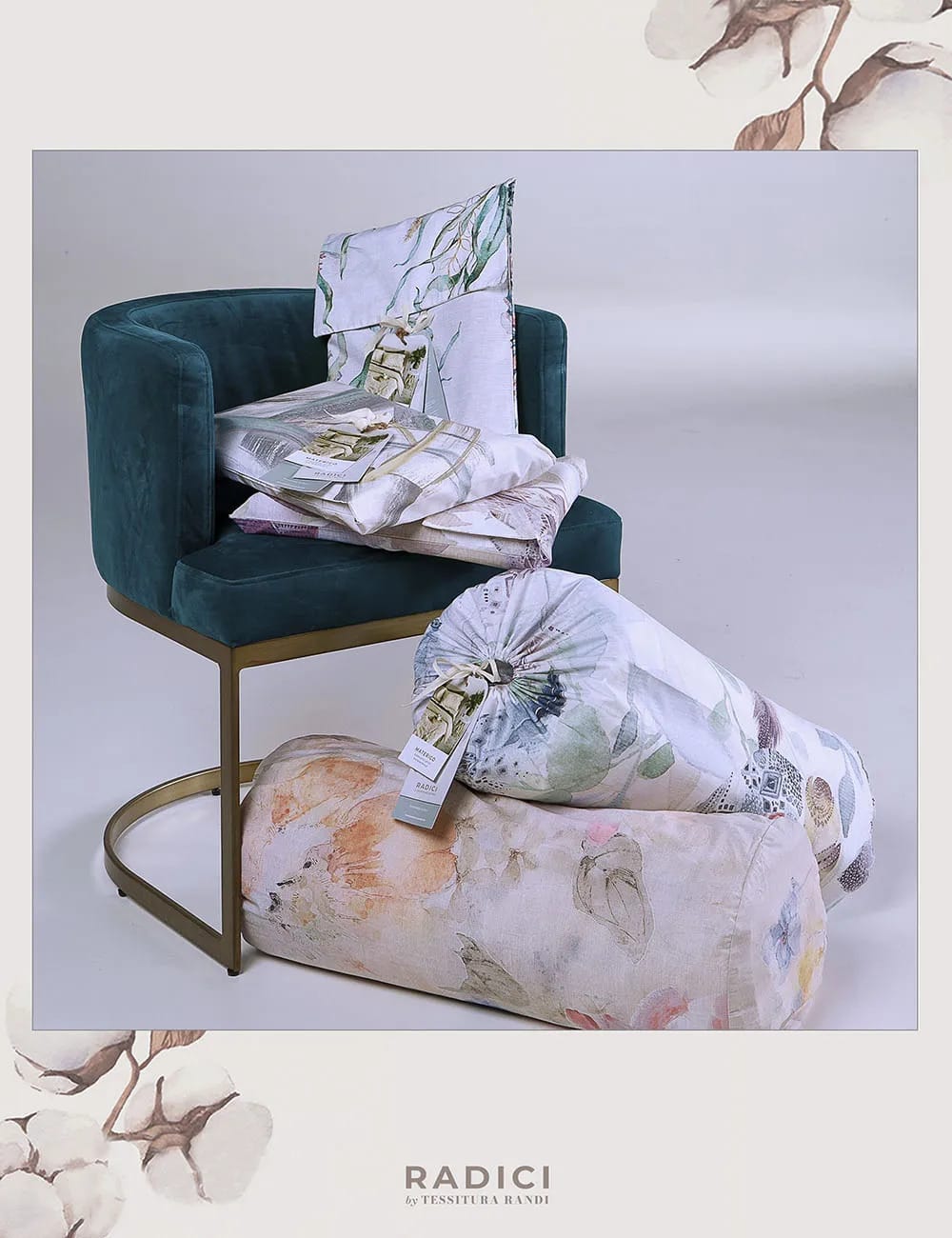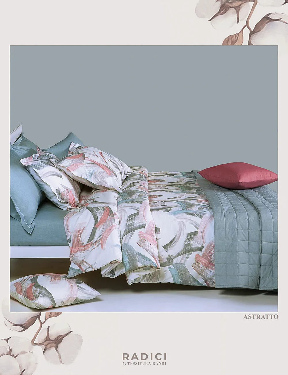 La sacca e le federe a 4 volant sono stampati in digitale con spenellate in sfumatura di colore; il sotto con angoli è stampato in tinta unita con un delicato motivo che ricorda la trama del lino.