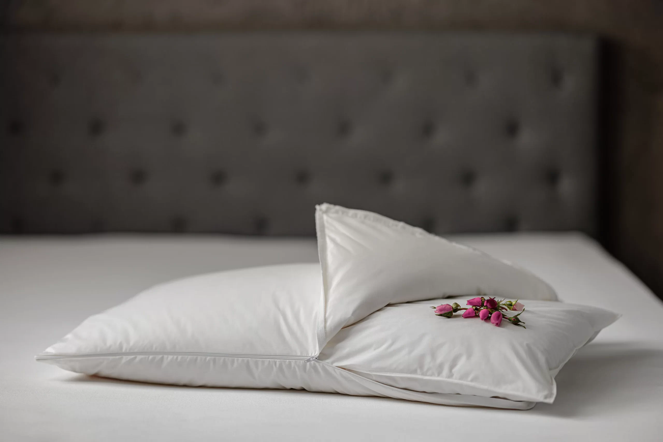 Cuscino PERLA ROSA DAUNENSTEP, con un nucleo di lana e petali di rosa, offre un supporto ottimale. Calma e relax per notti serene, con un design elegante e adatto a ogni posizione di sonno.