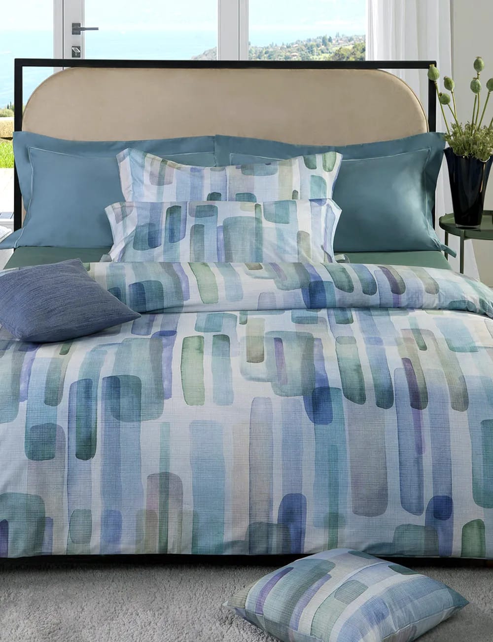 La sacca e la federa a 3 volant sono stampati in digitale con motivi geometrici, il sotto con angoli è in tinta unita.