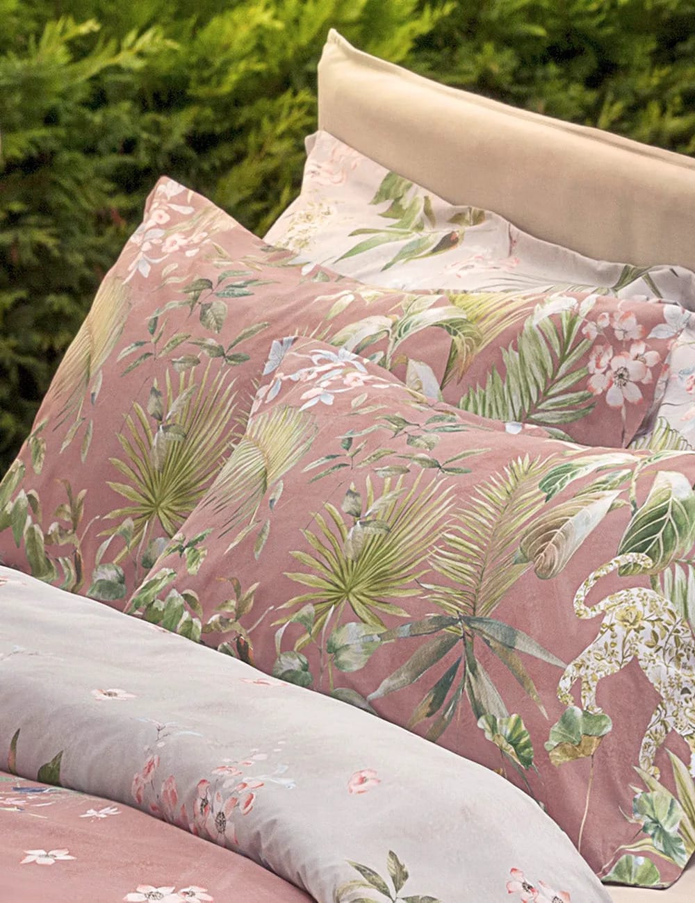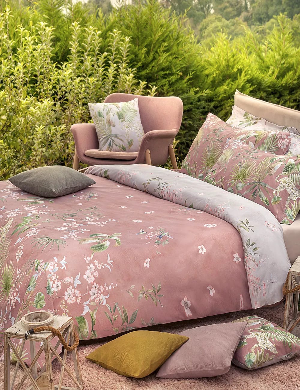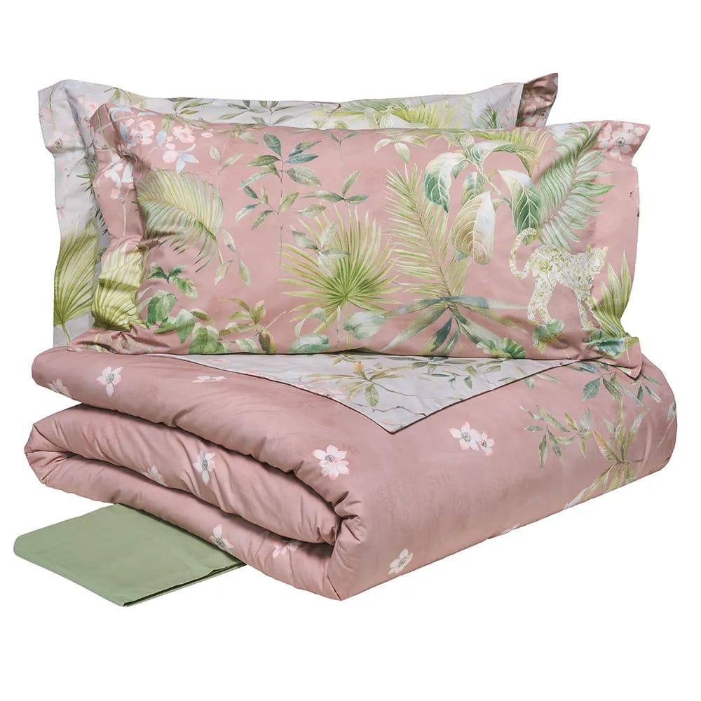 La sacca e le federe a 2 volant sono stampati in digitale con motivi floreali, il sotto con angoli è in tinta unita.